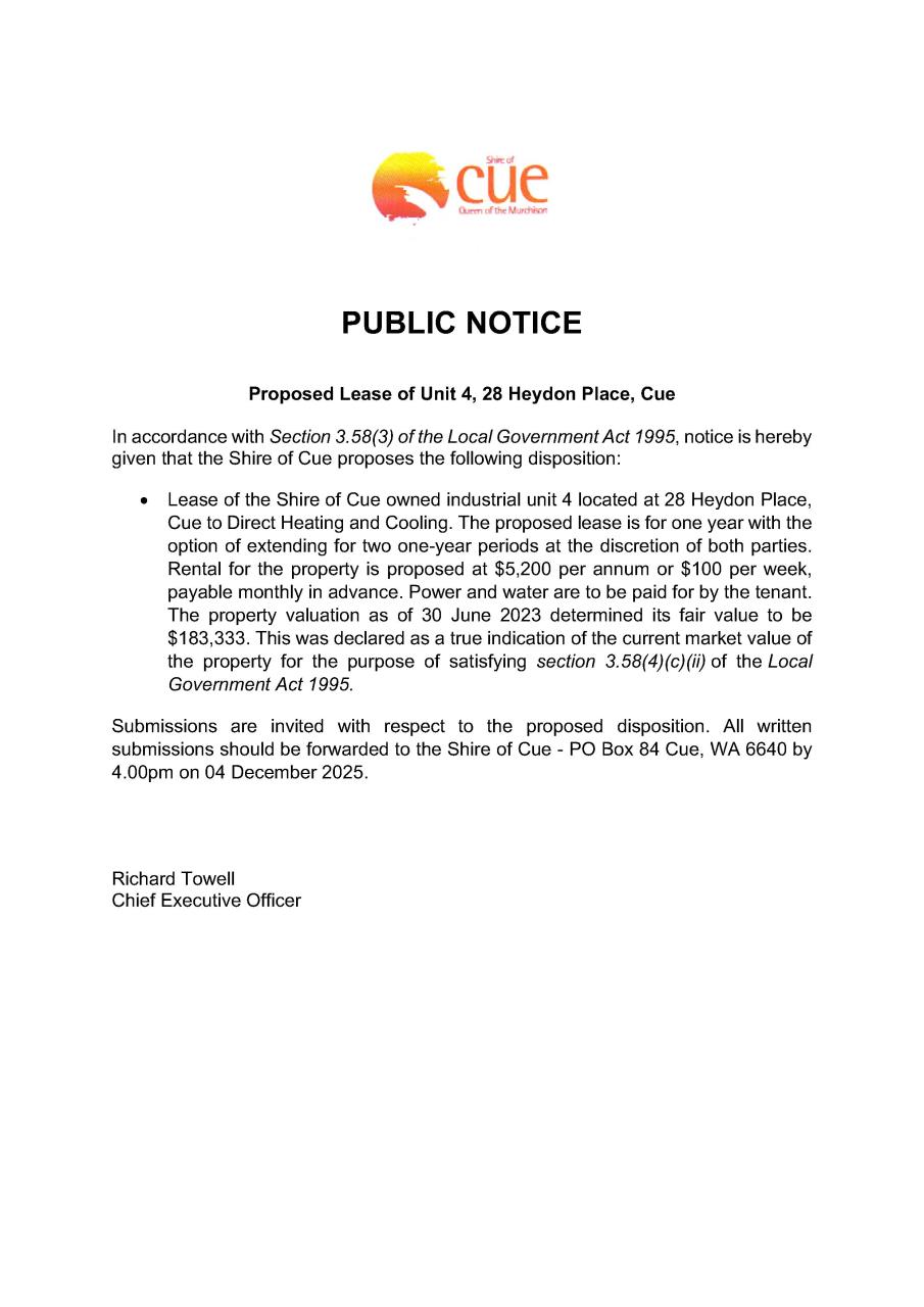 PUBLIC NOTICE lease Unit 4 28 Heydon Place Cue